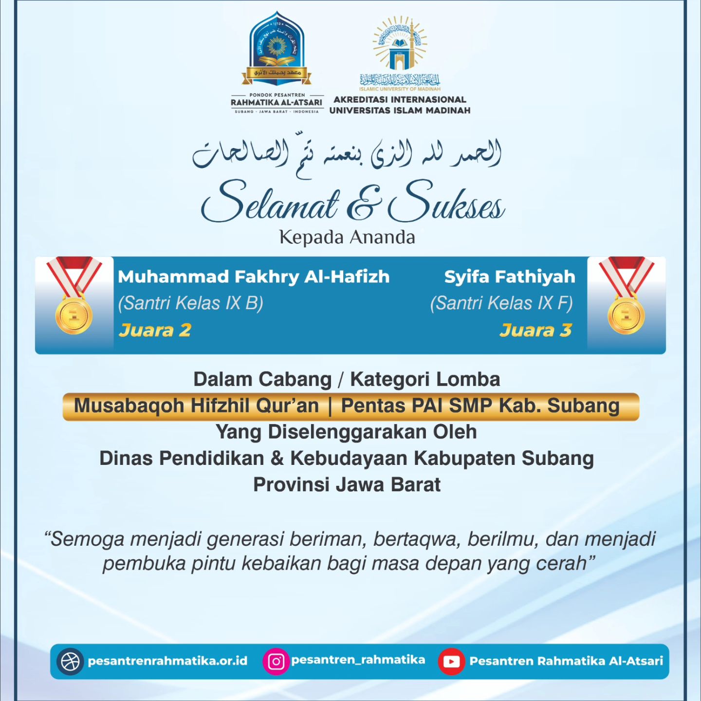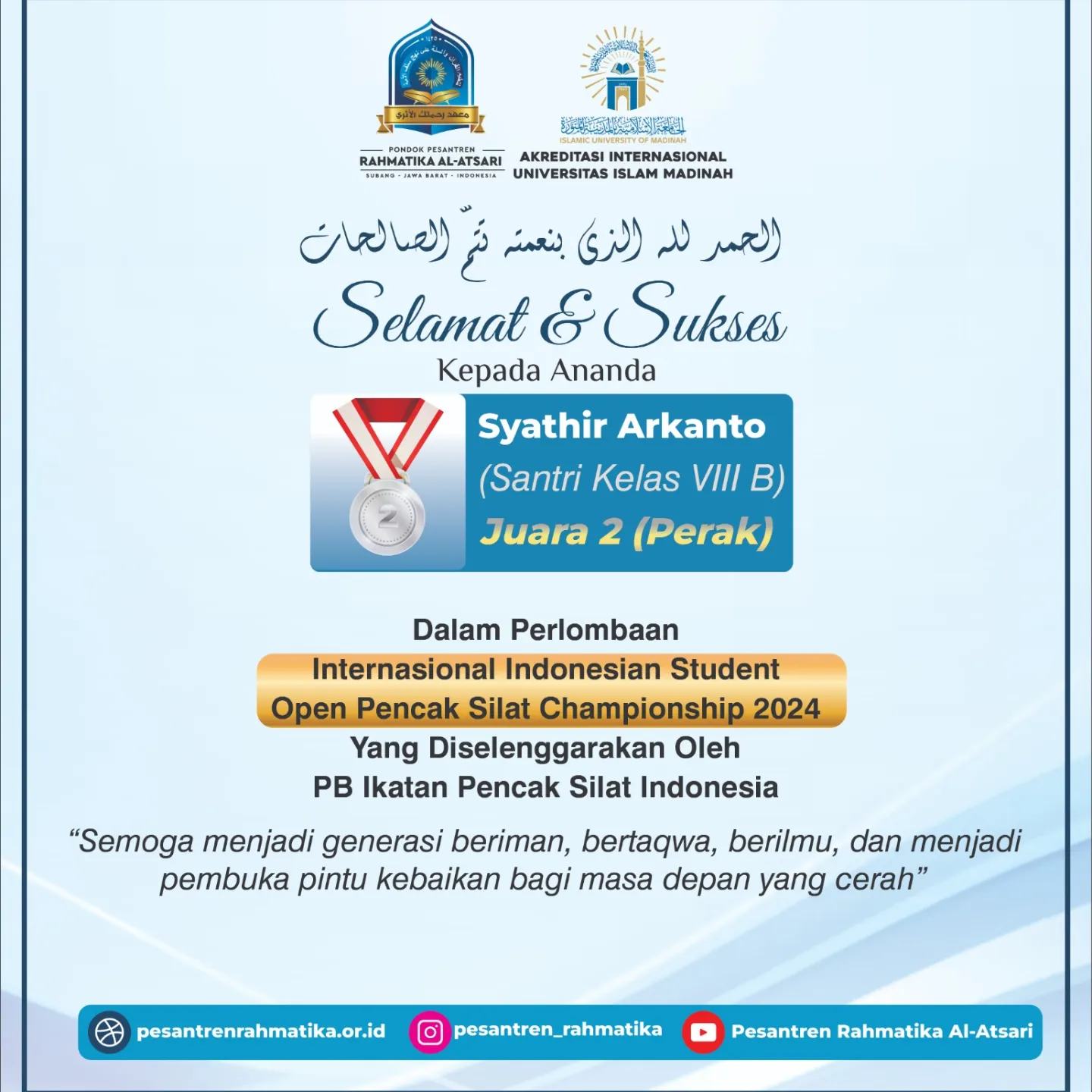Alhamdulillah, selamat dan sukses untuk salah satu santri kelas 8 SMP yang telah meraih juara 2 (Medali Perak) dalam Perlombaan Internasional Indonesia Student Open Pencak Silat.