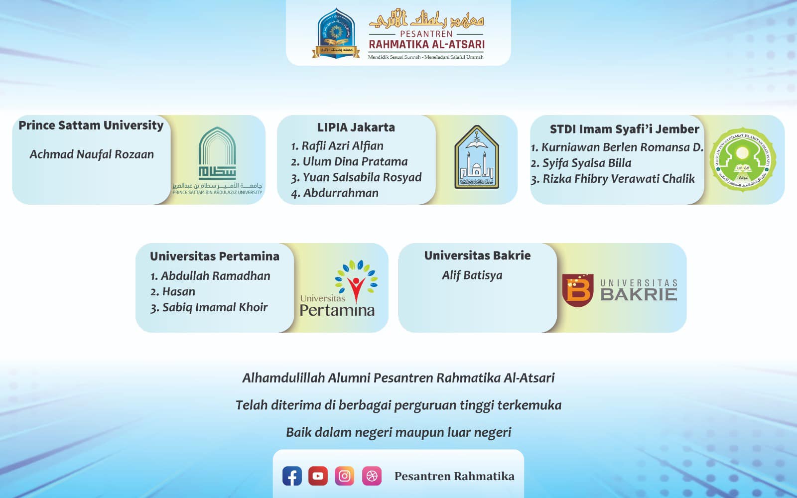 Alhamdulillah tabaarokallah, selamat dan sukses untuk para alumni yang diterima di universitas tujuan didalam dan luar negeri.